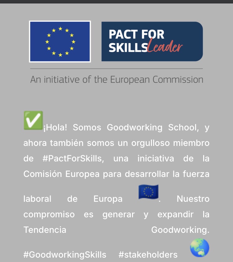 ✅¡Hola! Somos Goodworking School, y ahora también somos un orgulloso miembro de #PactForSkills, una iniciativa de la Comisión Europea para desarrollar la fuerza laboral de Europa . Nuestro compromiso es generar y expandir la Tendencia Goodworking. #GoodworkingSkills #stakeholders#wegotogether #GoodworkingTrend: Las prácticas que conforman la Metodología Goodworking reúnen un conjunto de Programas de Formación, Consultorías, Servicios, Productos y Proyectos Goodworking ®️RSC 10.0, que contienen en su esencia los tres pilares sobre los que se sustenta la educación complementaria de la escuela, que está construida para servir a las personas de nuestra sociedad. Estos pilares son: la comprensión y asimilación de las filosofías, tácticas y escenarios de ganar-ganar y All Win, en los negocios del siglo XXI; la comprensión de la ecuación vida/trabajo equilibrada y una mayor armonía personal y profesional; y la sostenibilidad ambiental, con una mayor conexión con la naturaleza en nuestro entorno más inmediato cada día.