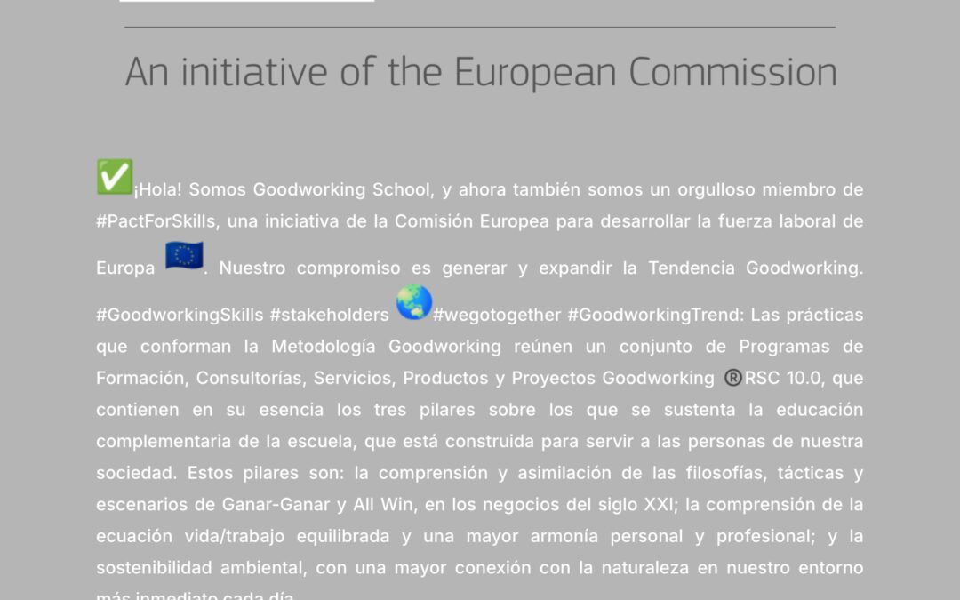 ✅¡Hola! Somos Goodworking School, y ahora también somos un orgulloso miembro de #PactForSkills, una iniciativa de la Comisión Europea para desarrollar la fuerza laboral de Europa . Nuestro compromiso es generar y expandir la Tendencia Goodworking. #GoodworkingSkills #stakeholders#wegotogether #GoodworkingTrend: Las prácticas que conforman la Metodología Goodworking reúnen un conjunto de Programas de Formación, Consultorías, Servicios, Productos y Proyectos Goodworking ®️RSC 10.0, que contienen en su esencia los tres pilares sobre los que se sustenta la educación complementaria de la escuela, que está construida para servir a las personas de nuestra sociedad. Estos pilares son: la comprensión y asimilación de las filosofías, tácticas y escenarios de ganar-ganar y All Win, en los negocios del siglo XXI; la comprensión de la ecuación vida/trabajo equilibrada y una mayor armonía personal y profesional; y la sostenibilidad ambiental, con una mayor conexión con la naturaleza en nuestro entorno más inmediato cada día.