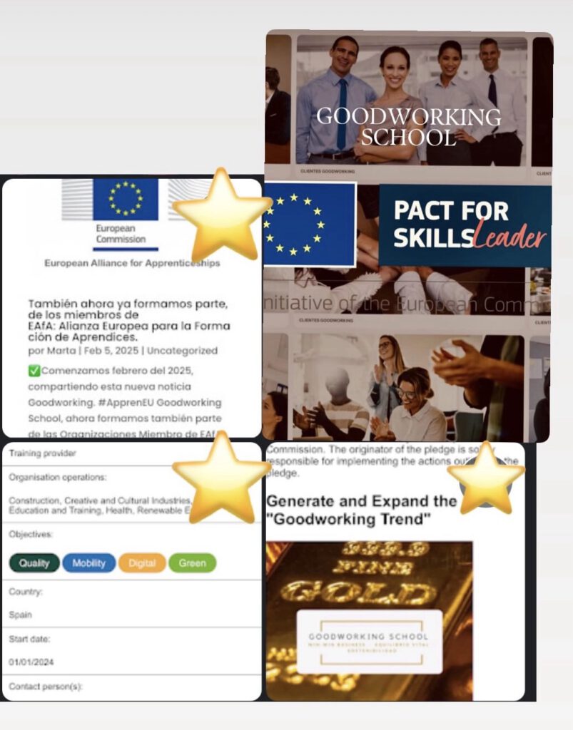 EL PROYECTO GOODWORKING SCHOOL ES UN MIEMBRO DE LOS LÍDERES DEL PACTO POR LAS HABILIDADES DE LA UNIÓN EUROPEA. ADEMÁS, HA SIDO MIEMBRO DE EAFA, APORTANDO SU CONOCIMIENTO Y COMPROMISO #GOODWORKINGTREND, A EAfA, LA ALIANZA EUROPEA PARA LA FORMACIÓN DE APRENDICES. [ COMISIÓN EUROPEA ]